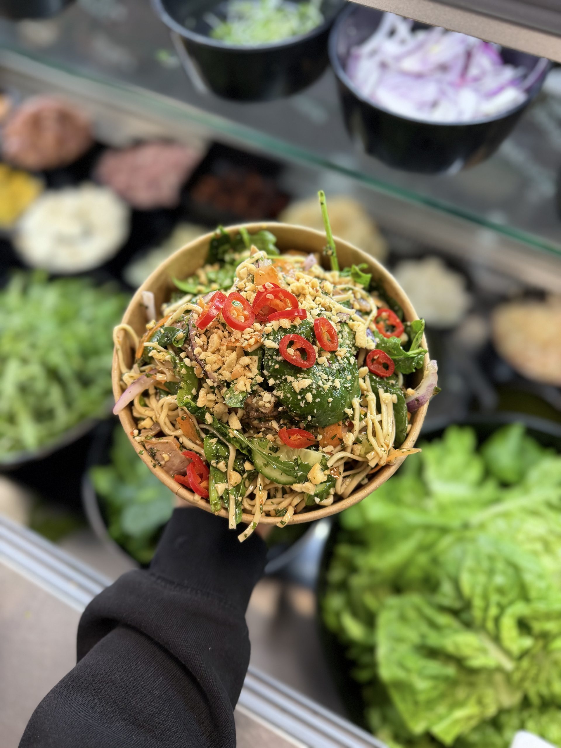 A fresh & vibrant lunch, packed with feel good flavours. Egg noodles, bound with spinach, strips of our in house roasted beef. Carrot ribbons, cucumber, onion, mint, coriander, salty peanuts & sweet chilli dressing!! Simply delicious!!